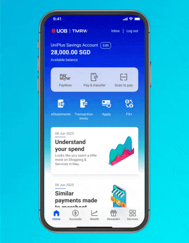 Meet UOB TMRW, the all-in-one banking app built around you and your needs. It features AI-driven insights, rewards personalised to you through Rewards+, and investing made simple through our expert wealth solutions.