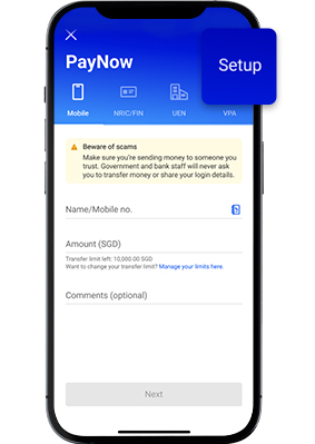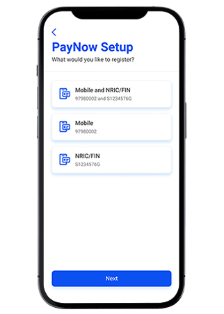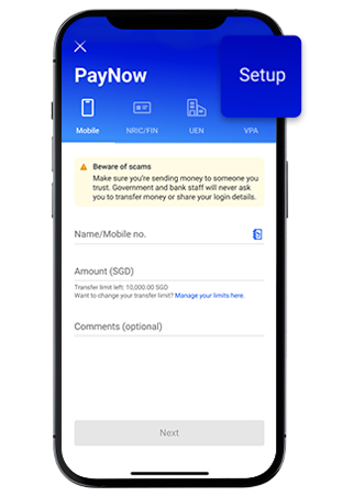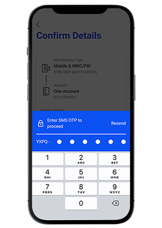 • Step 2: Enter the recipient’s mobile number, select their name from your contacts, or enter their NRIC/FIN.